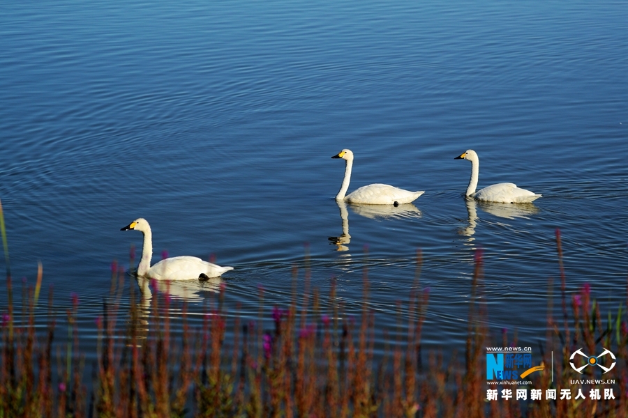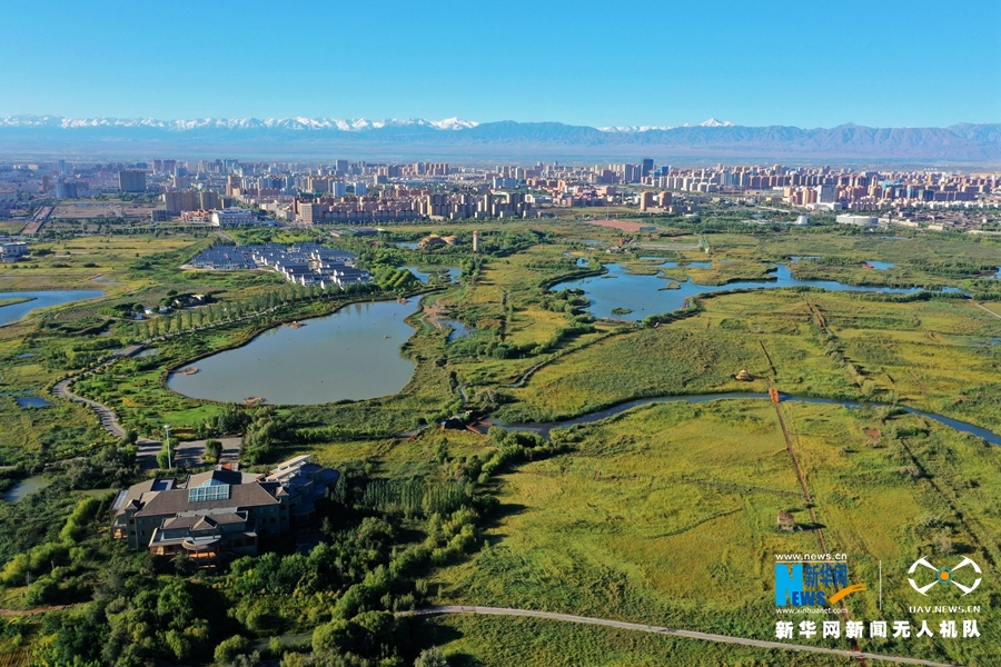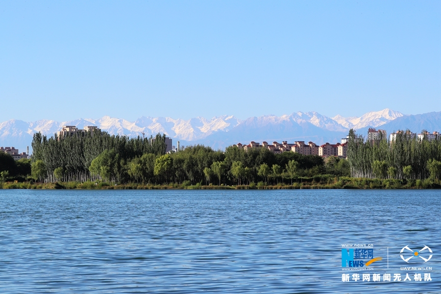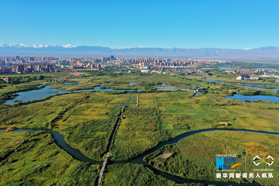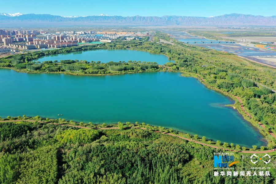 初秋雨后的清晨,甘肃张掖国家湿地公园远山含黛、碧空如洗、水鸟欢歌,勾勒出生态之城如画风光。新华网发(成林 摄)