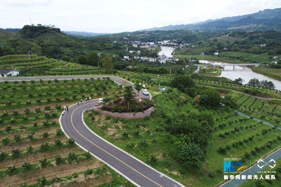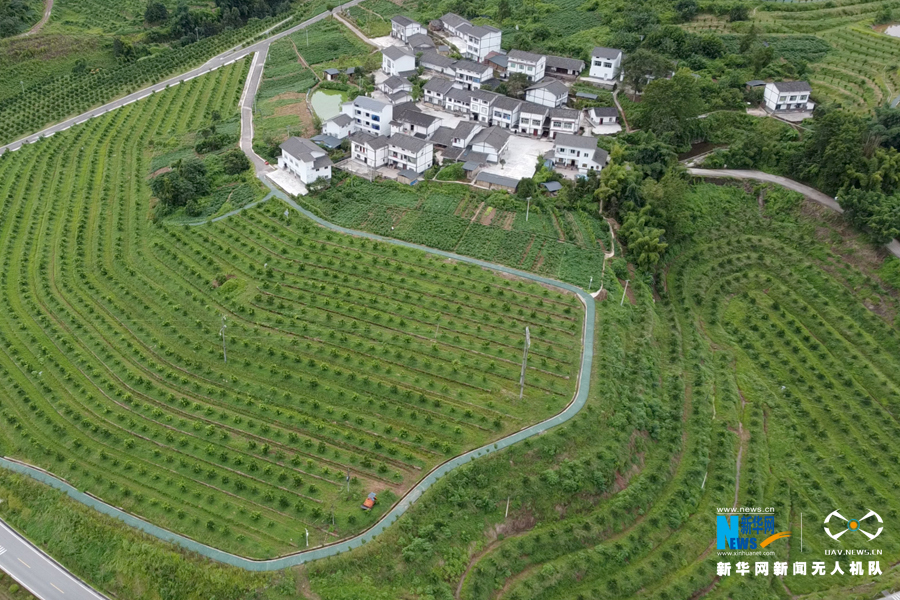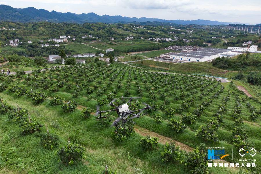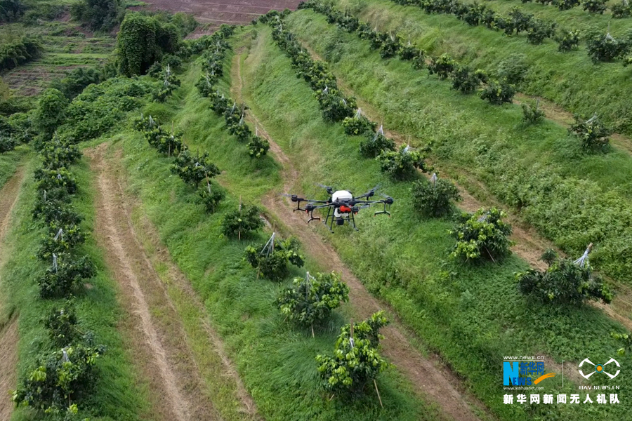 图为大型农业无人植保机在果园内进行喷洒作业。新华网 耿骏宇 摄