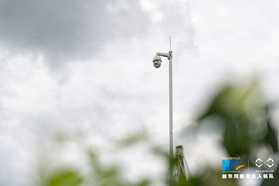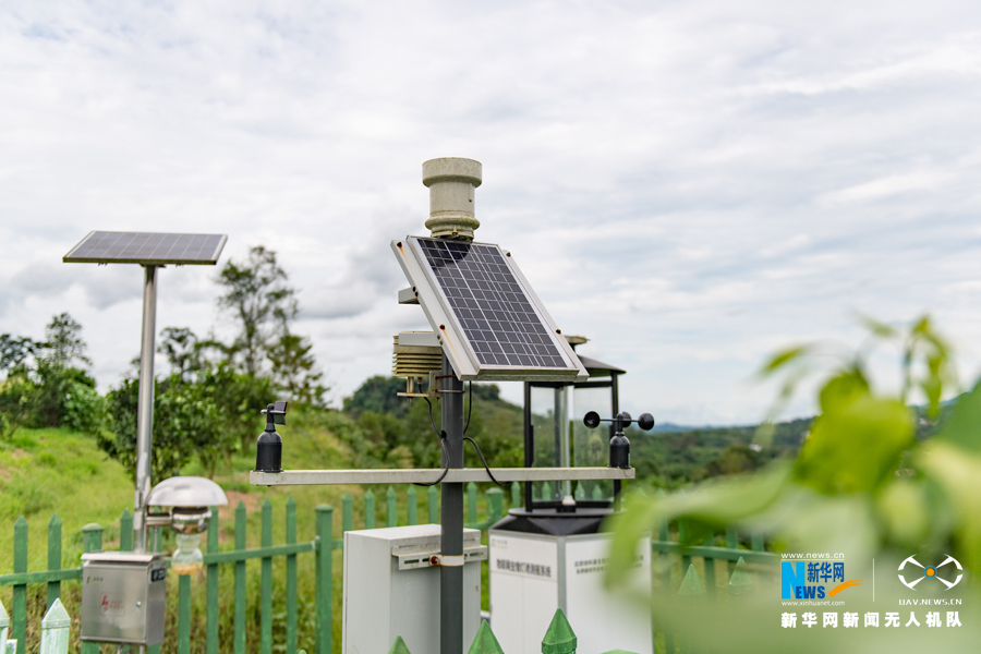 图为果园内的“小气候监测站”,主要用于监测园区内的大气温、湿度、风速、风向、即时降雨量、累计降雨量、光照强度等信息。新华网 耿骏宇 摄