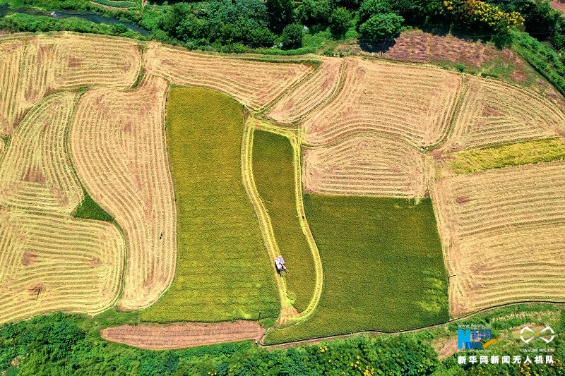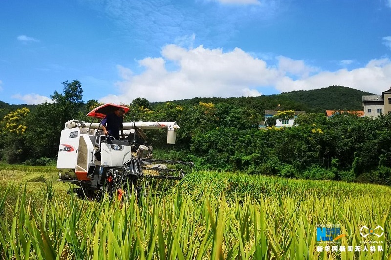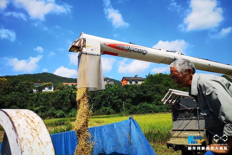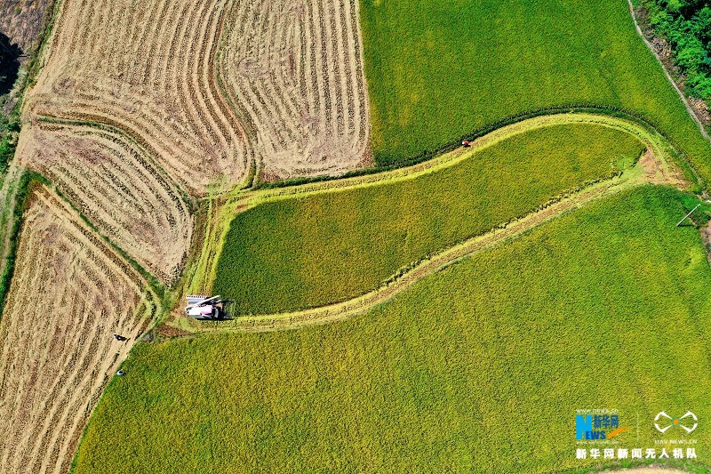 图为宜都市松木坪镇江家湾村中稻收割现场。朱灿义摄 新华网发