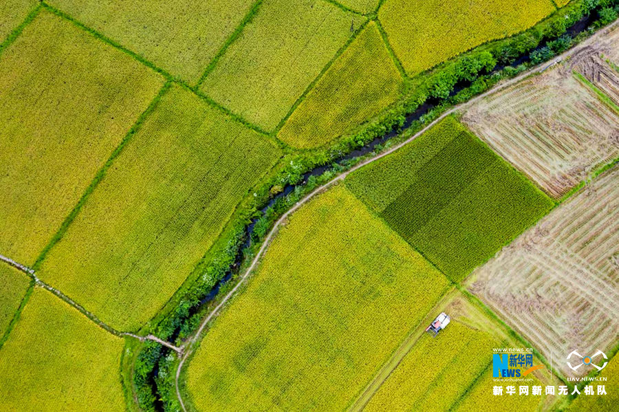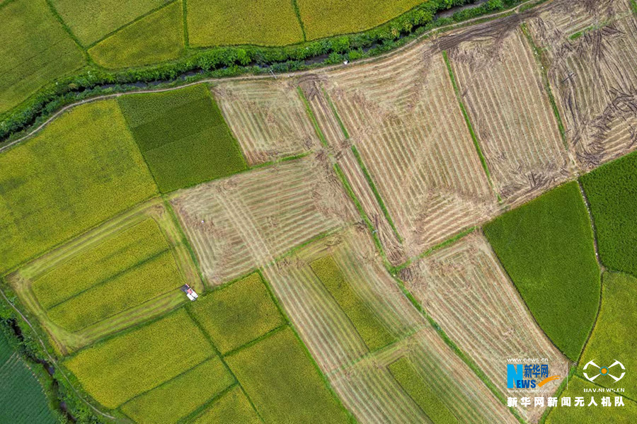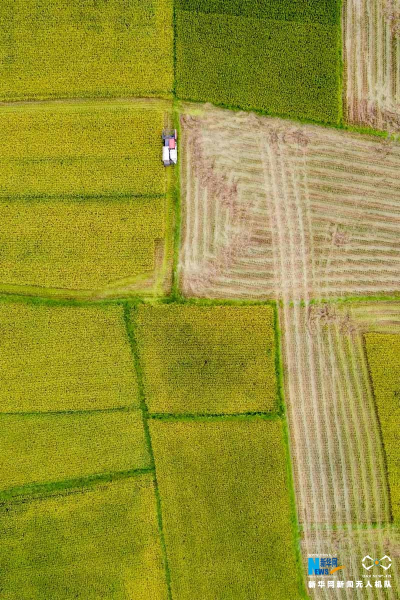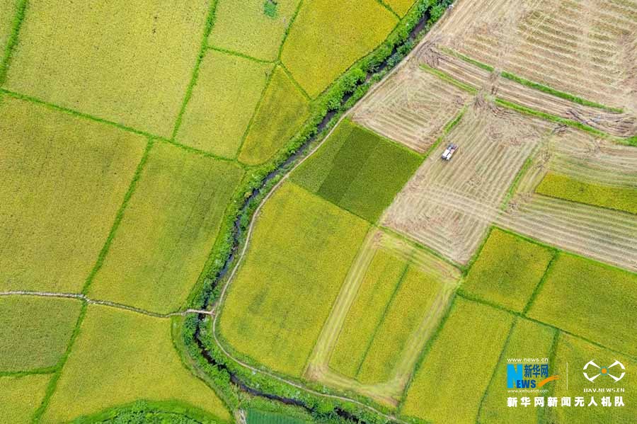 咸丰县高乐山镇白果坝村收割稻谷。新华网发 康林摄