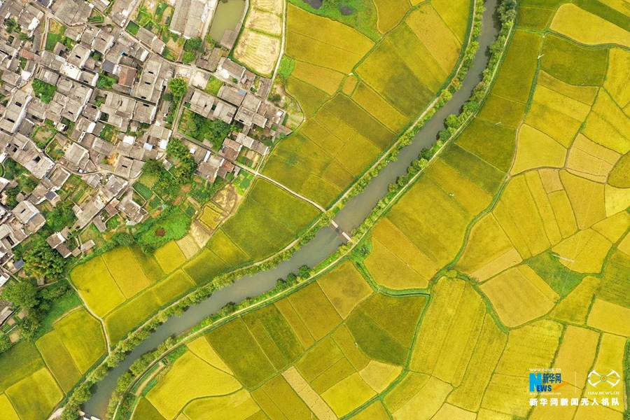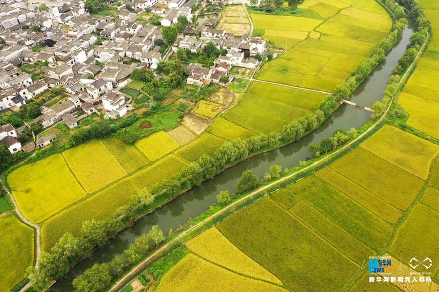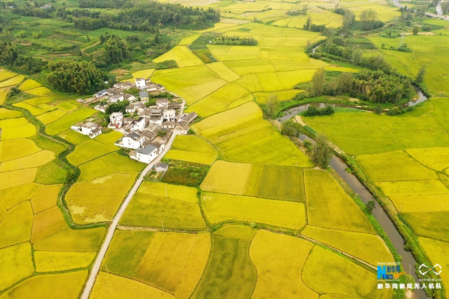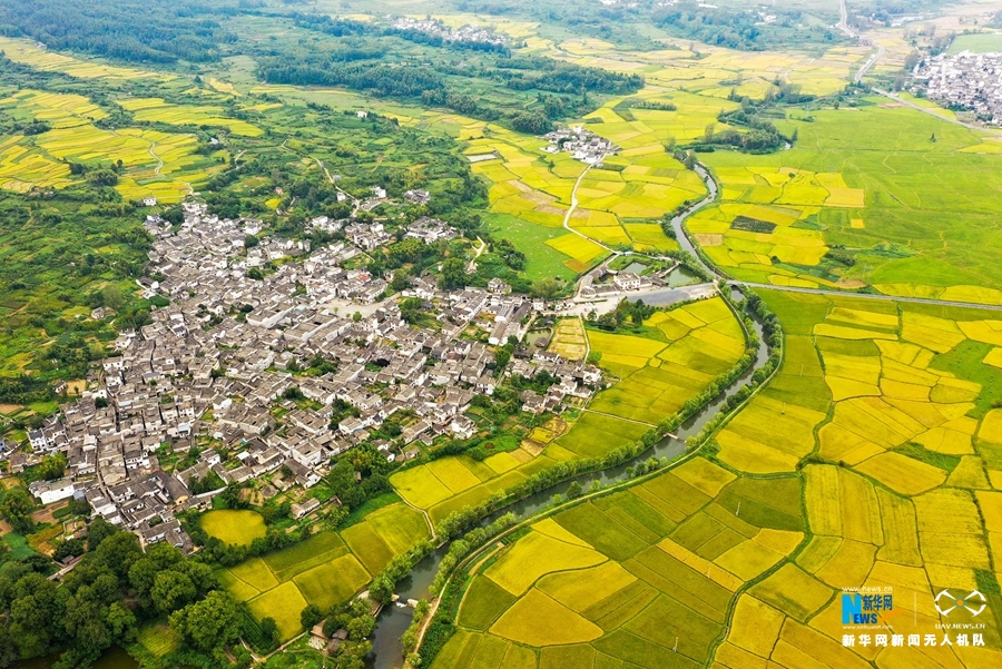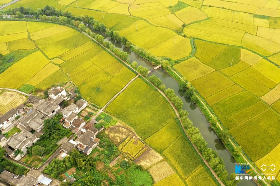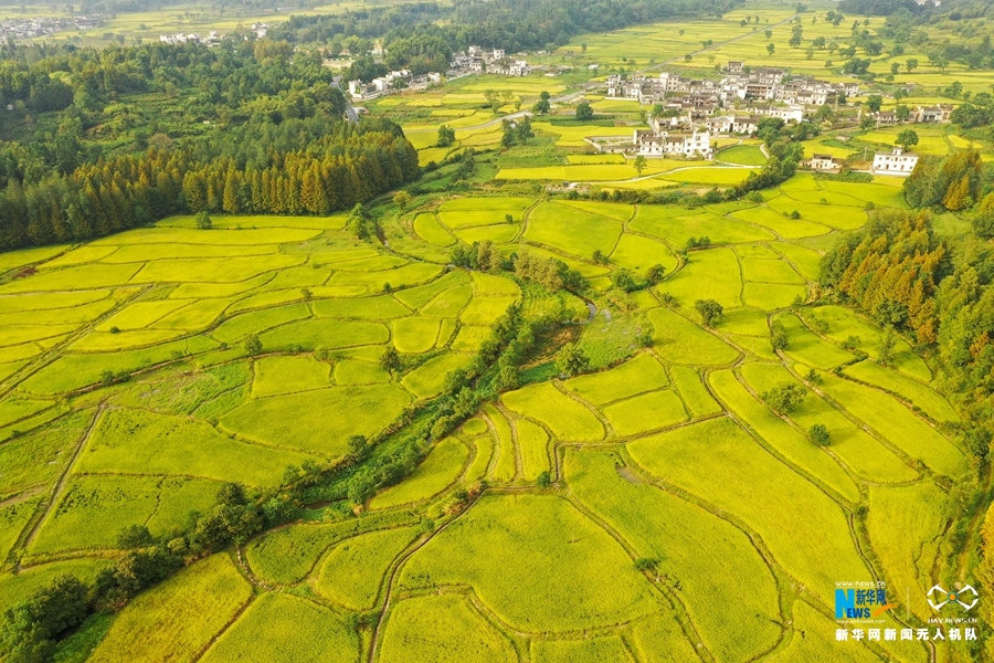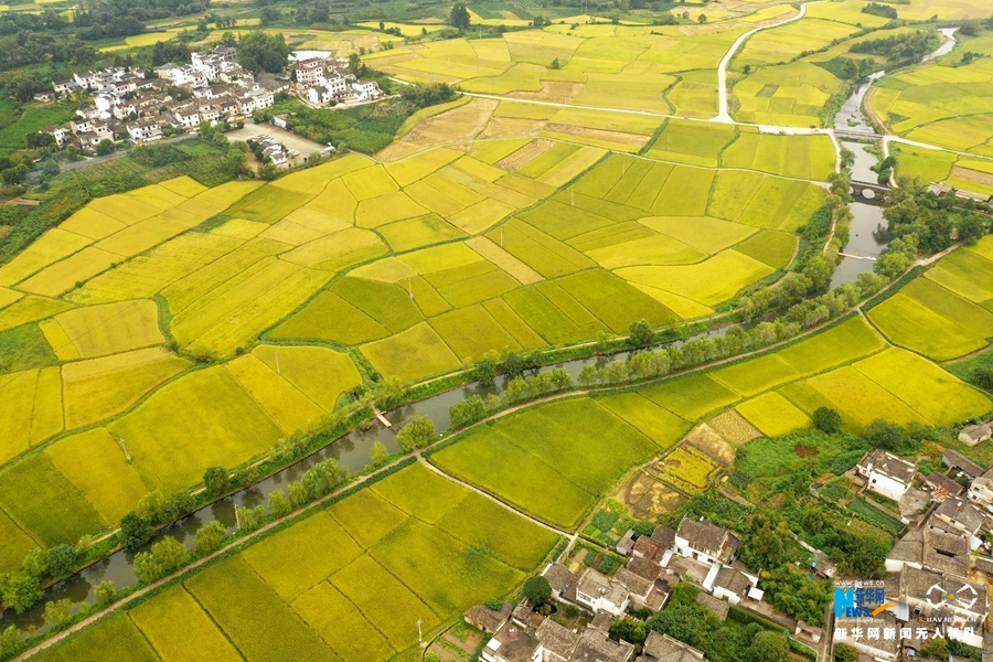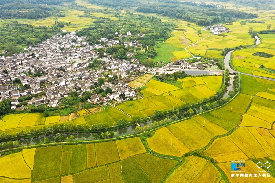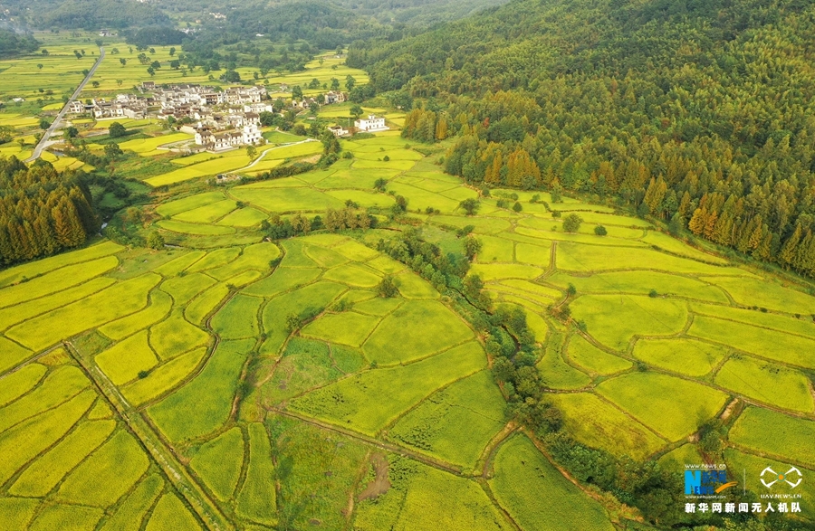 入秋后,安徽省黄山市黟县连片的稻田渐次变黄,阡陌纵横,秋风拂动,稻浪翻滚,田园风光美不胜收。新华网发(施亚磊 摄)