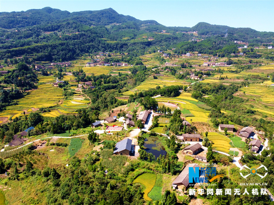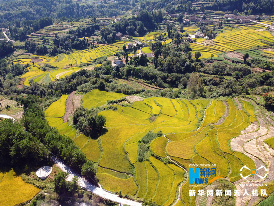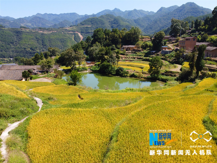 湖北省巴东县东瀼口镇牛洞坪村金黄的稻田。新华网发 王嫣然 摄