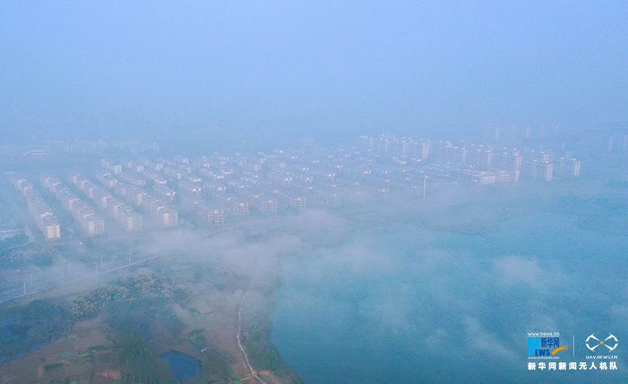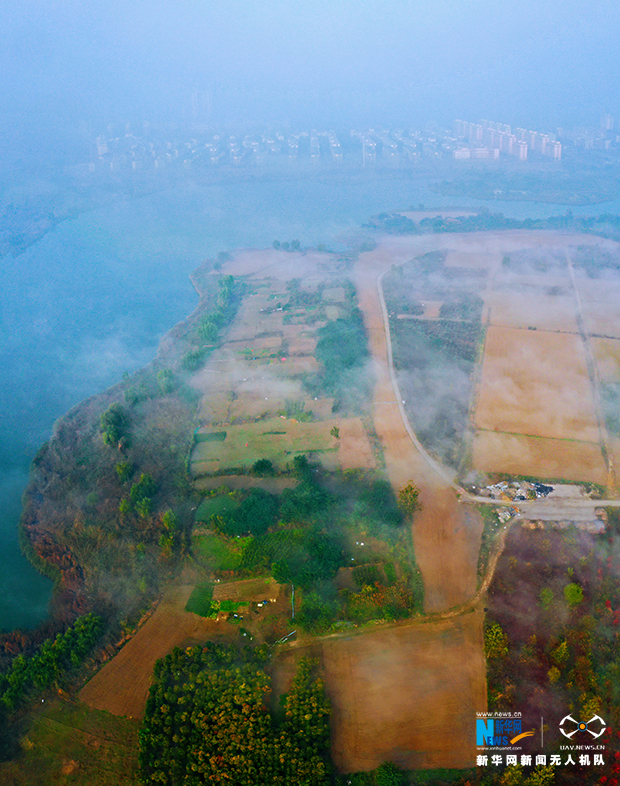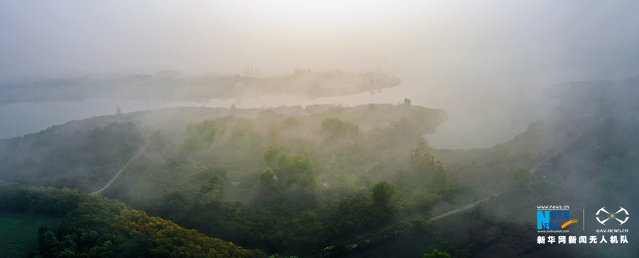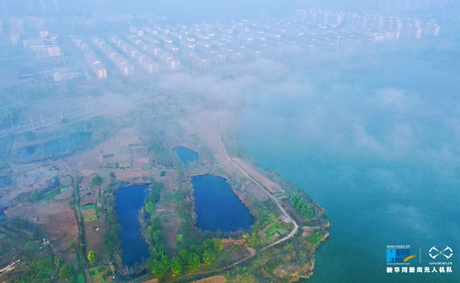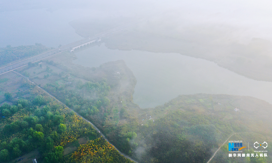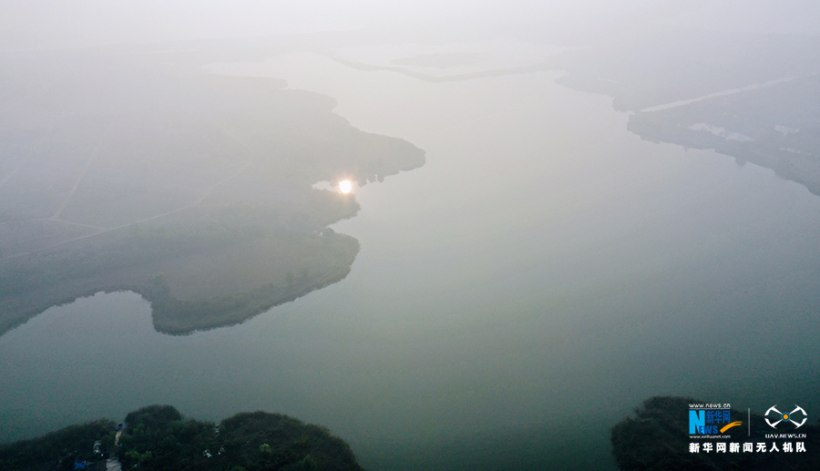 10月22日,薄雾笼罩中的安徽省淮北市东湖湿地公园。新华网发(王文 摄)