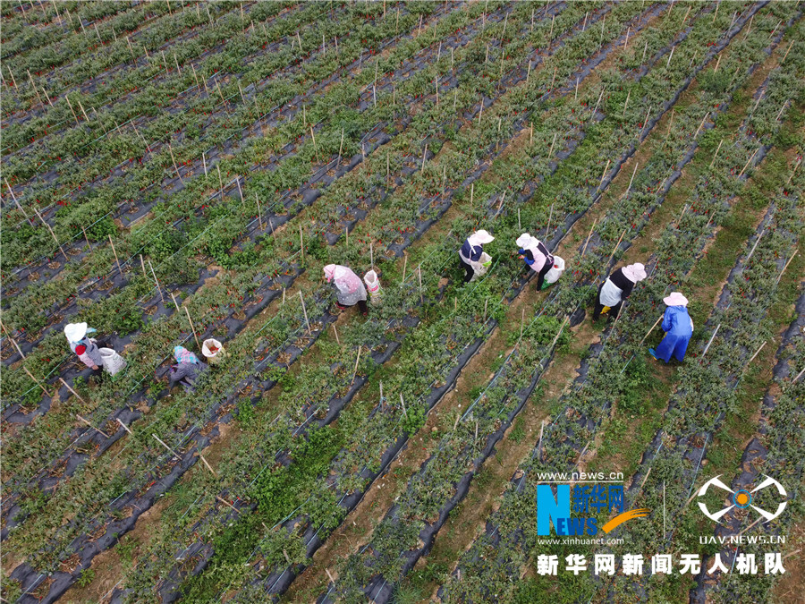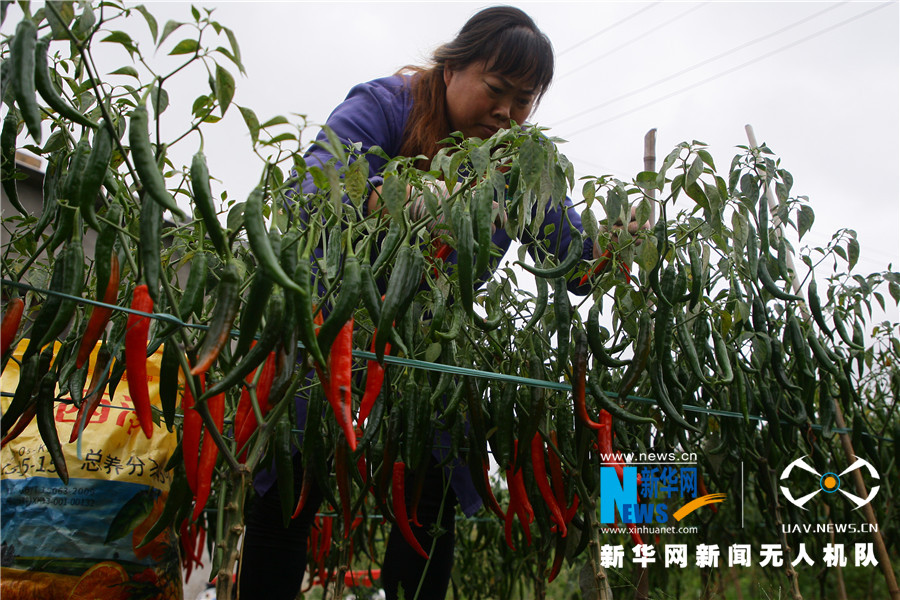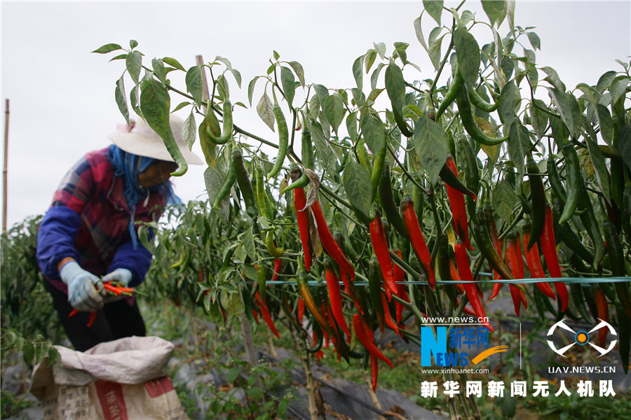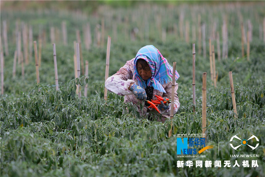航拍盘江镇中村村民采摘辣椒(10月10日摄)。新华网发(杨俊鹏 摄)