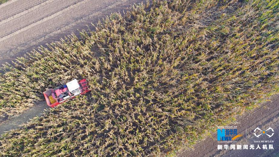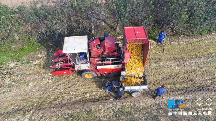 当地村民使用农业机械收获玉米。新华网 发(兰立强 摄)