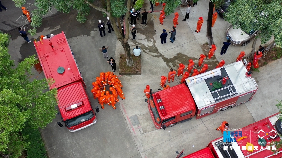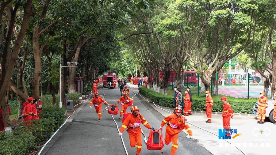 参赛队伍在泵车结合以水灭火、定向越野识图用图、3000米野外负重跑等五个项目上展开比拼。图为泵车结合以水灭火比赛现场。新华网发