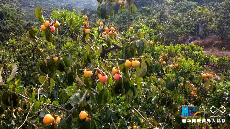 成熟饱满的柿子挂满枝头。新华网发(胡东和摄)